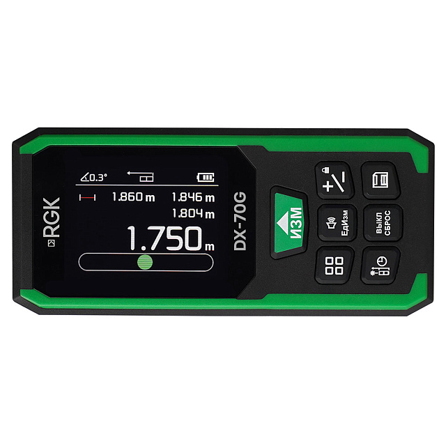 Лазерный дальномер RGK DX-70G представляет собой компактный строительный инструмент, предназначенный для определения линейных размеров, расстояний и угловых величин с расчетом дополнительных параметров.