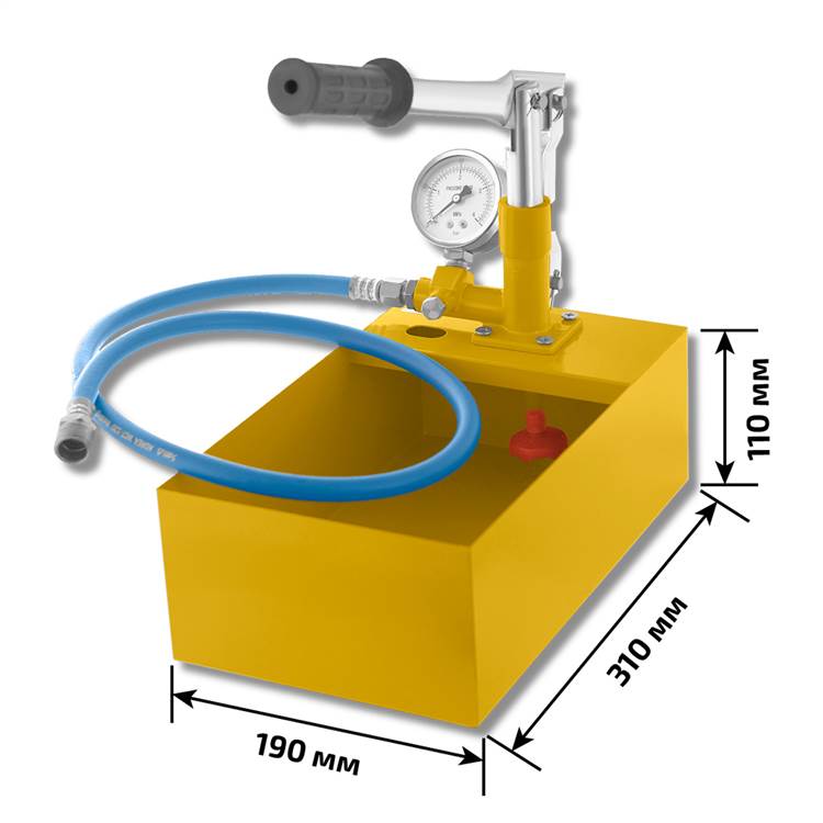 МЕГЕОН 98040 – это ручной инструмент специально разработанный для гидравлических испытаний ёмкостей, проверки герметичности магистралей, трубопроводов, водопровода, сантехники, систем пожаротушения и отопления, технологического оборудования, паровых котлов и многих других применений, идеален для добавления рабочей среды в закрытые контуры. Насос закреплен на сварном баке изготовленном из листовой стали с покрытием устойчивым к воздействию разнообразных жидкостей, на выходе установлен манометр рассчитанный на 40 кгс/см2 (4 МПа) с хорошо читаемой шкалой для контроля создаваемого давления, клапан сброса по завершении работ и гибкий РВД для подсоединения к испытуемому объекту. Прочный шарнир рычага с длинной рукояткой обеспечивает точную передачу усилий на поршень при наименьшем износе. Фильтр грубой очистки для защиты от взвеси и крупных частиц.
