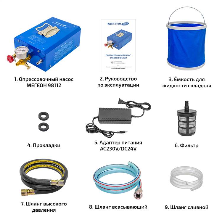 Электрический опрессовочный насос МЕГЕОН 98112 предназначен для осуществления опрессовки и проверки герметичности трубопроводов в системах водоснабжения и отопления. В конструкции насоса используется вибрационный агрегат с электроприводом, обеспечивающий создание высокого давления (до 12 кгс/см²). Для контроля выходного давления предусмотрен манометр с двумя шкалами измерения. Насос оснащен фильтром грубой очистки от механических примесей, необходимыми шлангами и складной емкостью для жидкости.