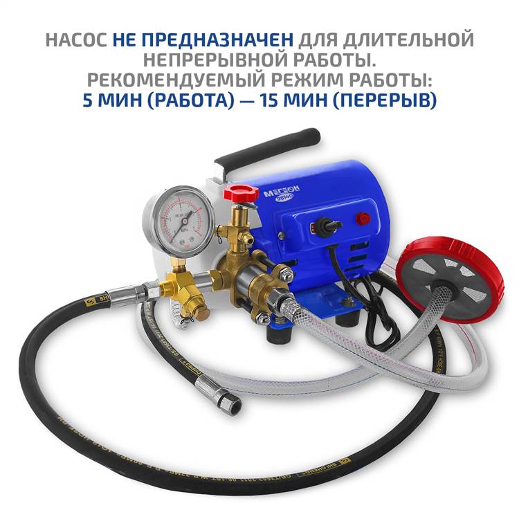 Насос идеально подходит для закачки рабочей среды в замкнутые контуры. В качестве резервуара используется пластиковый контейнер объемом 17 литров, устойчивый к воздействию различных жидкостей. Насос оснащен регулируемым редукционным клапаном, манометром с пределом измерения 40 кгс/см² (4 МПа) и устройством сброса давления по завершении работ. Гибкий рукав высокого давления (РВД) обеспечивает подключение к объекту испытаний. Для защиты от взвеси и крупных частиц предусмотрена система грубой очистки.