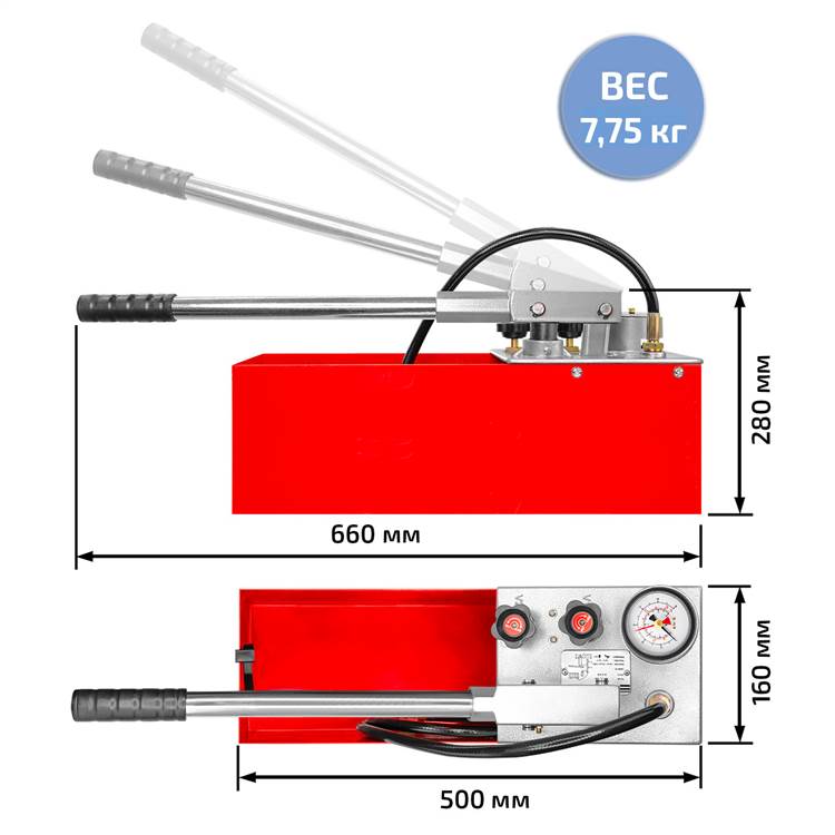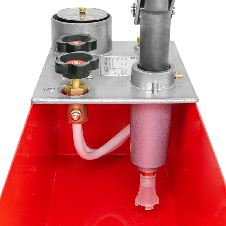 Конструкция насоса включает в себя бак для рабочей жидкости, манометр для контроля создаваемого давления и гибкий шланг для подключения к объекту испытания. Инновационная система клапанов обеспечивает стабильность создаваемого давления. Особо прочный шарнирный механизм рычага с длинной рукояткой гарантирует точную передачу усилий на поршень, минимизируя износ. Бак из листовой стали обладает высокой стойкостью к воздействию окружающей среды и низким температурам. Насос дополнительно оснащен фильтром для защиты от загрязнений и манометром с хорошо читаемой шкалой.
