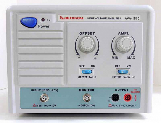 AVA-1810 оснащен многоступенчатой защитой выходной цепи от перегрузок. Амплитуда выходного сигнала регулируется с высокой точностью десятиоборотным резистором. Дополнительно предусмотрена возможность установки смещения постоянной составляющей. Для мониторинга выходных характеристик предусмотрен отдельный выход «Monitor» с коэффициентом ослабления 100:1, предназначенный для подключения к осциллографу.