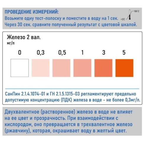 Для быстрого и экономичного определения наличия железа в воде используется химический метод с визуальной оценкой. Тест-полоска, пропитанная специальным индикатором, погружается в воду на 1 секунду. Через 60 секунд после окрашивания индикатора его цвет сравнивается с цветовой шкалой, прилагаемой к набору.