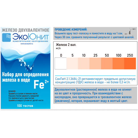 Представленный набор предназначен для быстрого и удобного определения концентрации железа в воде.