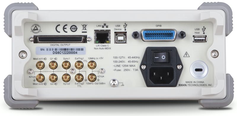 Подключение и управление: RIGOL DG5252 поддерживает USB-host, USB-device и LAN интерфейсы. Устройство совместимо с USB накопителями (FAT) и позволяет удаленное управление через сеть Ethernet.