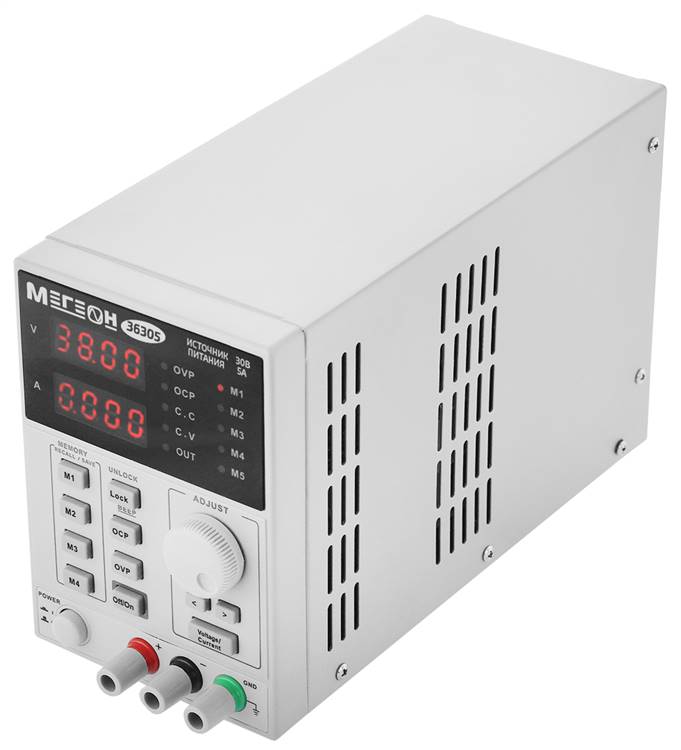 Модель МЕГЕОН 36305 представляет собой компактный, программируемый одноканальный источник питания с высокой точностью. Он обеспечивает выходное напряжение в диапазоне от 0 до 30 В при токе нагрузки от 0 до 5 А.
