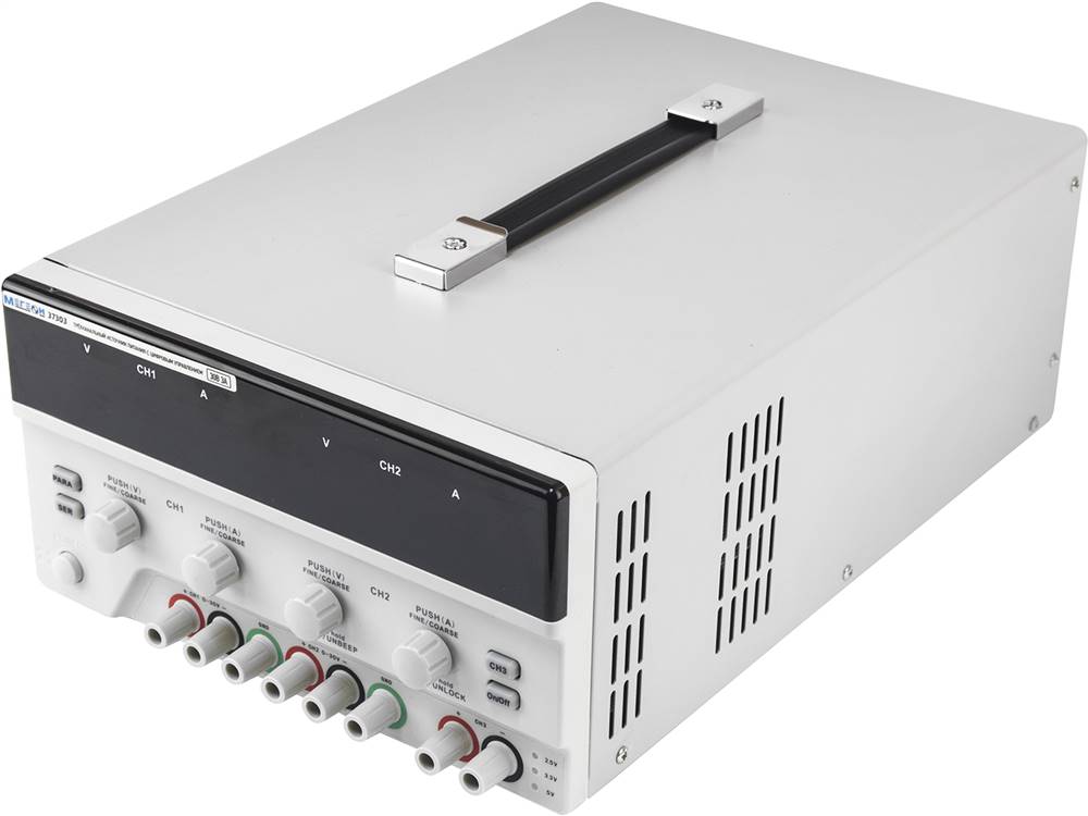 МЕГЕОН 37303 представляет собой компактный, высокоточный источник питания с тремя каналами и цифровым управлением. Два канала обеспечивают регулируемое выходное напряжение от 0 до 30 В с током нагрузки до 3 А. Третий канал является фиксированным переключаемым источником напряжения 2.5В, 3.3В или 5В также с током нагрузки до 3 А.