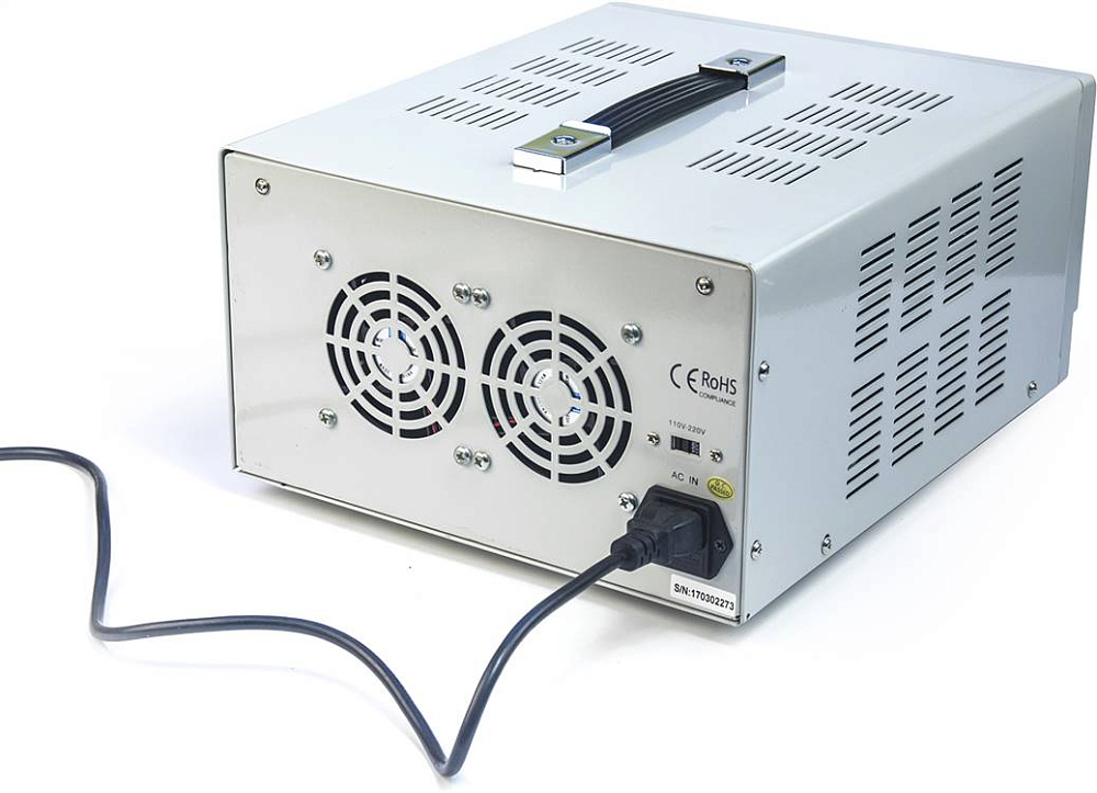Он оснащён двумя независимыми регулируемыми каналами, обеспечивающими напряжение от 0 до 30 В при токе нагрузки до 5 А. Дополнительно имеется фиксированный канал с напряжением 5 В и током нагрузки до 3 А. Прибор позволяет реализовать различные схемы подключения двух каналов.