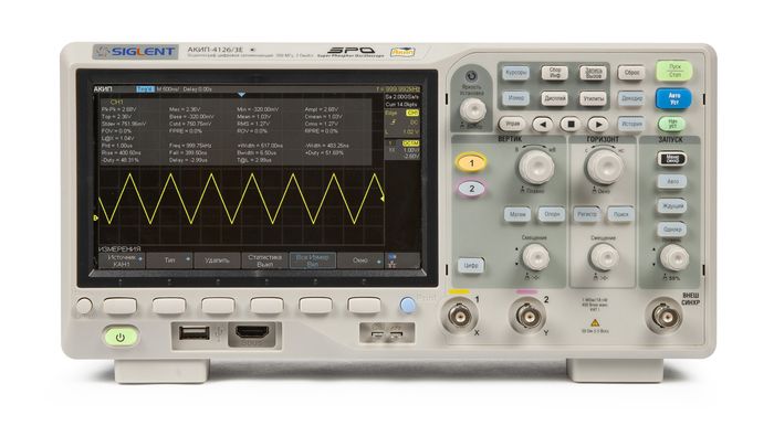 Осциллограф модели АКИП-4126/3E оснащен двумя независимыми каналами, что предоставляет возможность одновременного измерения и визуализации сигналов, поступающих от двух различных источников. Высокая полоса пропускания (350 МГц) гарантирует точность измерений в широком диапазоне частот. Максимальная частота дискретизации 2 ГГц позволяет с высокой степенью достоверности воспроизводить быстро изменяющиеся сигналы.