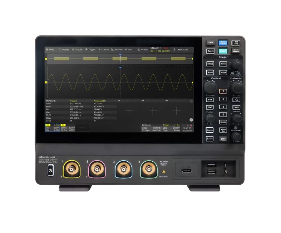 Устройства оснащены 2 или 4 аналоговыми каналами и 16 цифровыми каналами, что позволяет проводить анализ смешанных сигналов. Технология Siglent SPO, реализованная в серии АКИП-4144, обеспечивает максимальную скорость захвата сигналов до 120 000 осциллограмм/с (в нормальном режиме) и до 500 000 осциллограмм/с (в последовательном режиме), а также 256-уровневую градацию интенсивности с режимом отображения цветовой температуры.