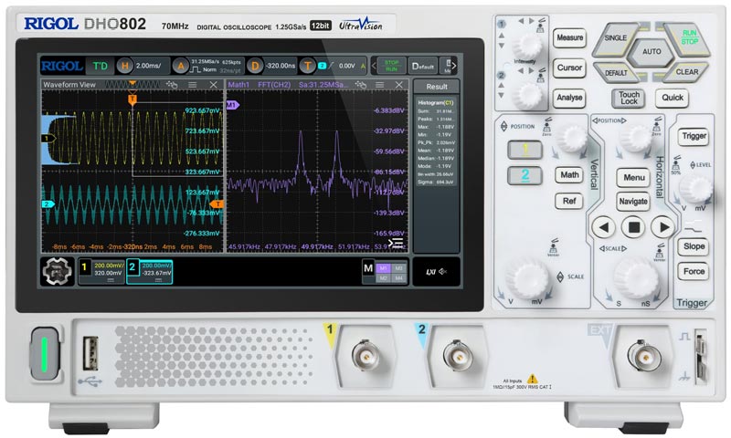 RIGOL DHO802 представляет собой цифровой осциллограф реального времени с двумя каналами, характеризующийся низким уровнем шума и функцией запоминания. Принадлежащий к бюджетному сегменту рынка, он обладает полосой пропускания до 70 МГц и оснащен цветным сенсорным экраном диагональю 7 дюймов (разрешение 1024x600 точек). Корпус осциллографа выполнен в удобном и компактном дизайне.